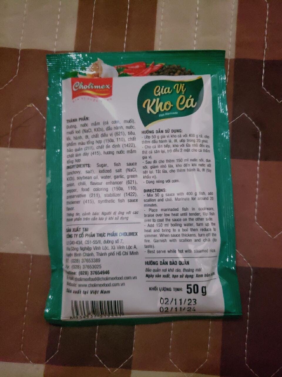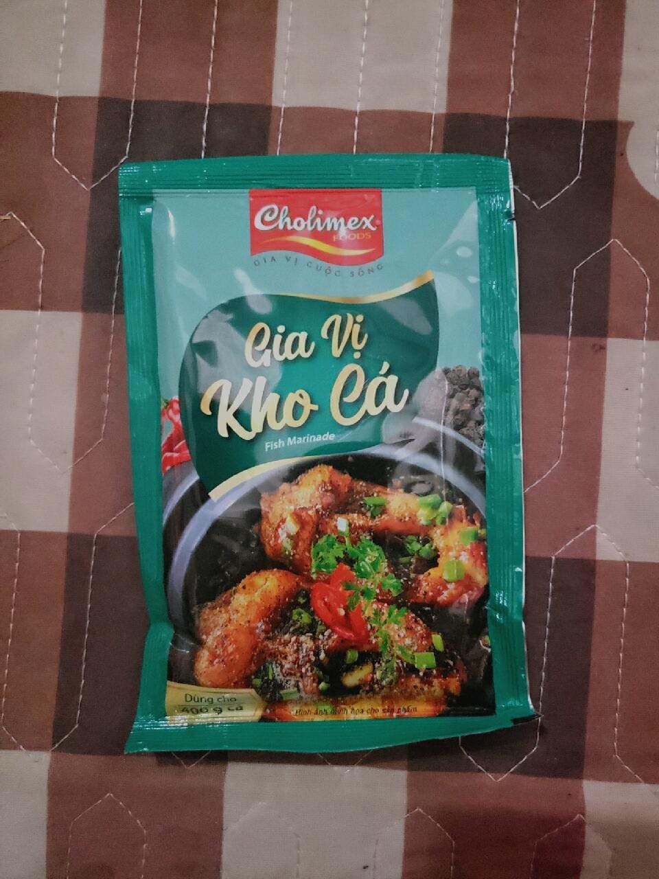 • Gia vị kho cá Cholimex rất tiện dụng cho các món cá kho vì tổng hợp đủ các gia vị như nước mắm, tỏi, hành, đường, muối, bột ngọt, nước màu, tiêu...đặc biệt có thêm ớt để khử mùi tanh của cá.